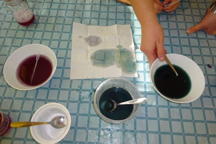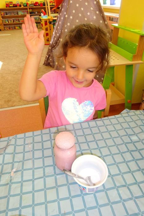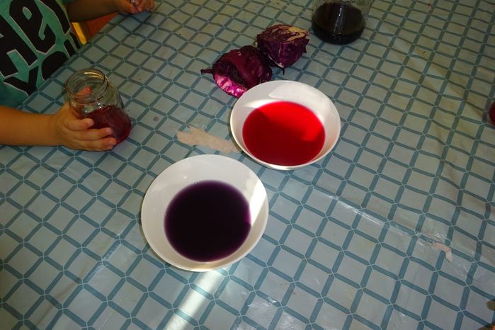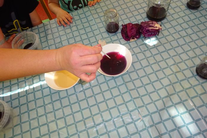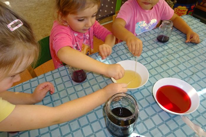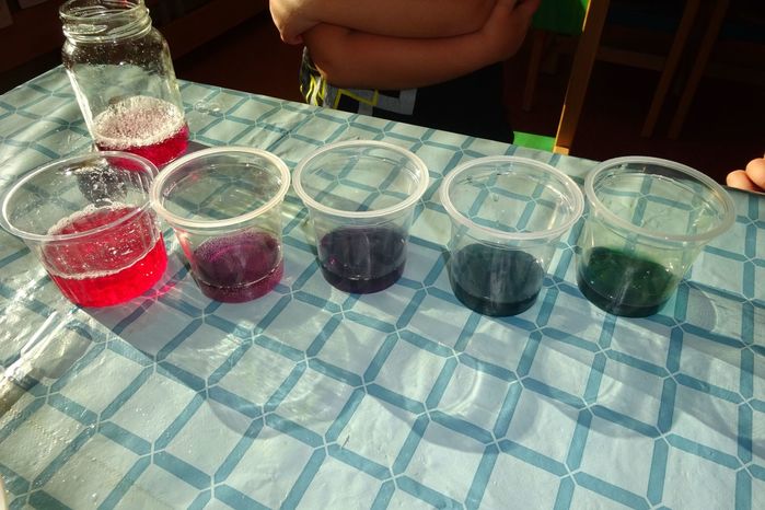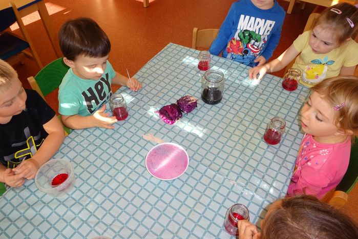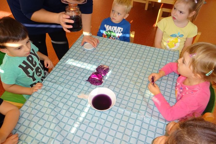 Dnes si děti vyzkoušely pokusy s vývarem z červeného zelí, který měnil barvu a konzistenci pomocí octu a jedlé sody.