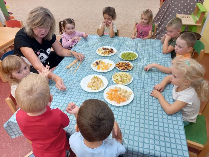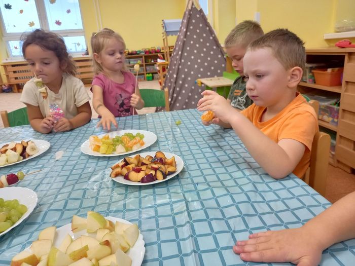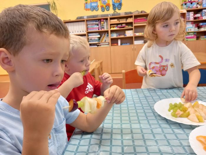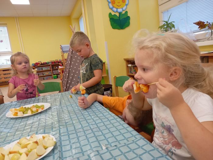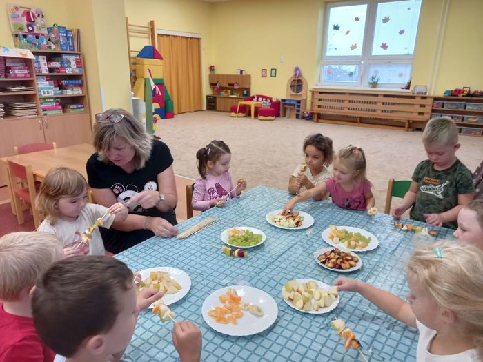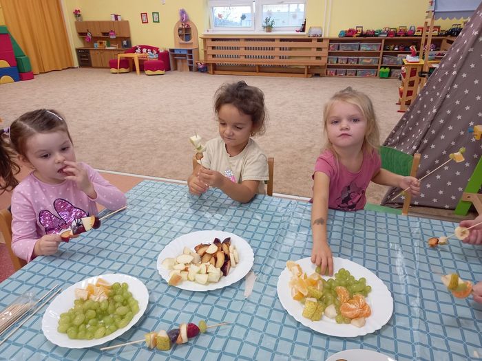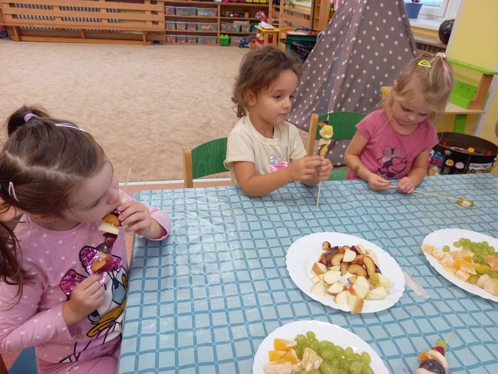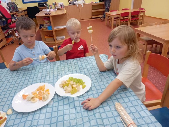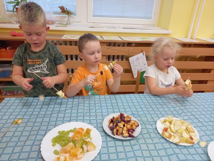Děti si dnes samy vyráběly špízy z ovoce, které donesly do školky.