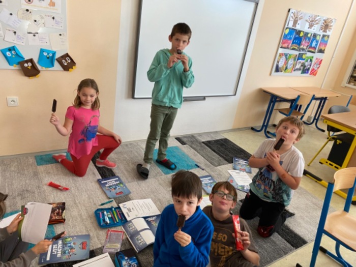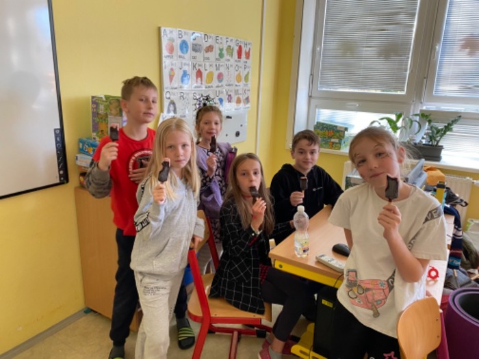 Na zpestření velké přestávky dostaly děti sponzorský dar z restaurace Hrabyńka - výborný jahodový nanuk.