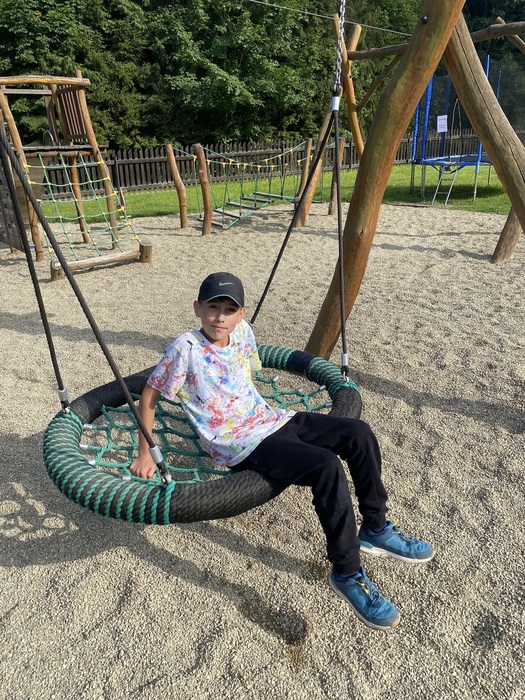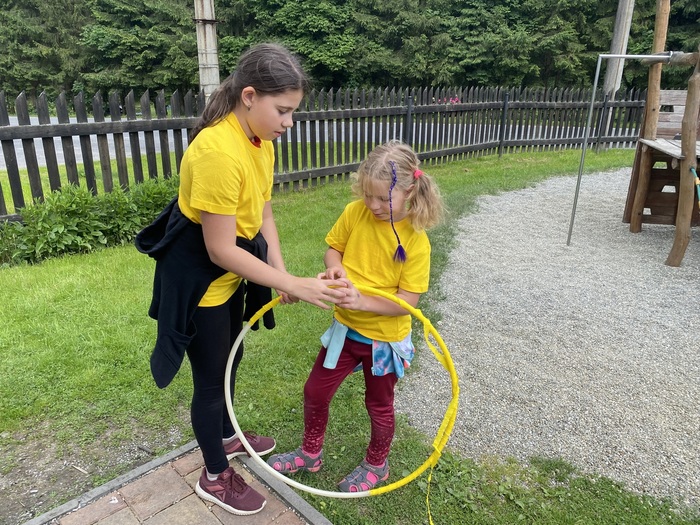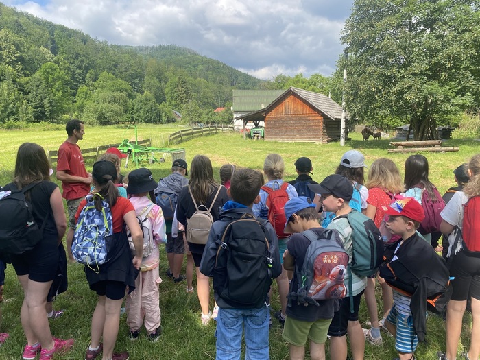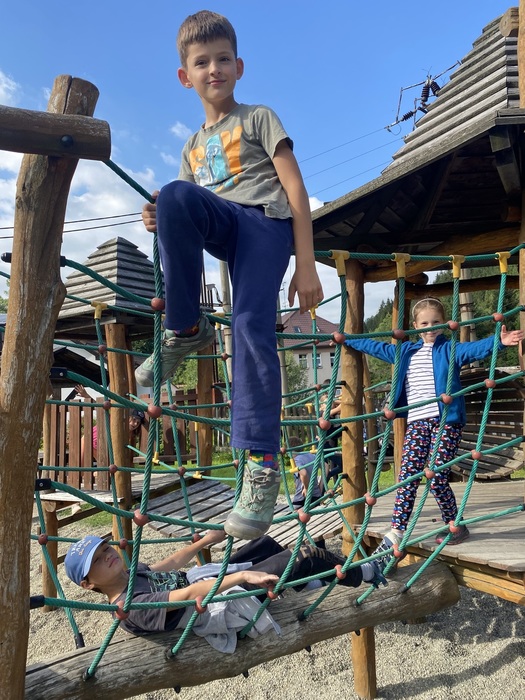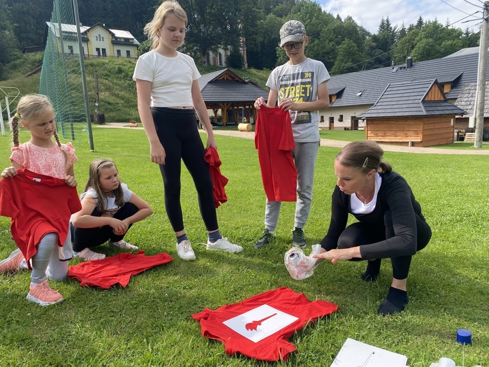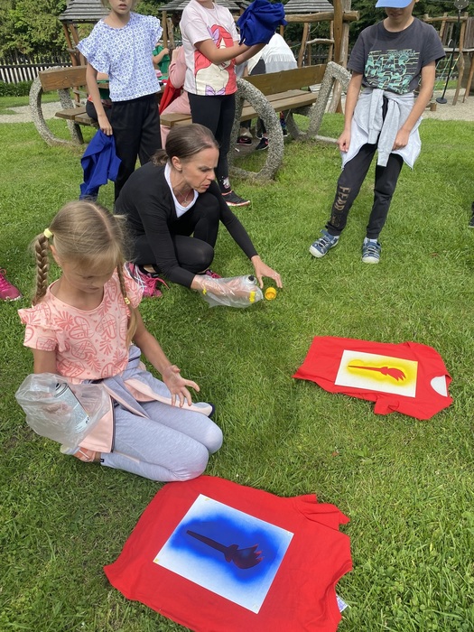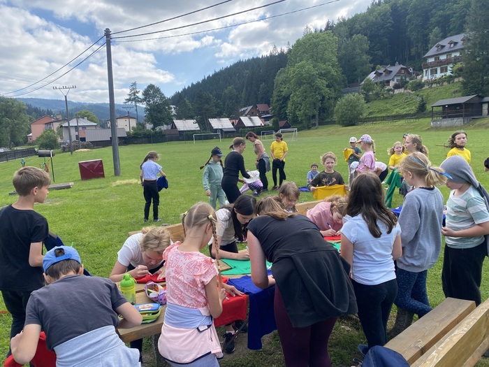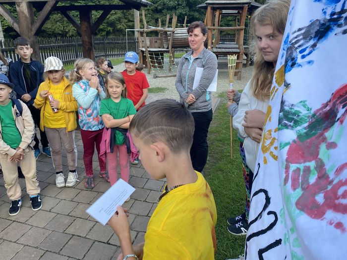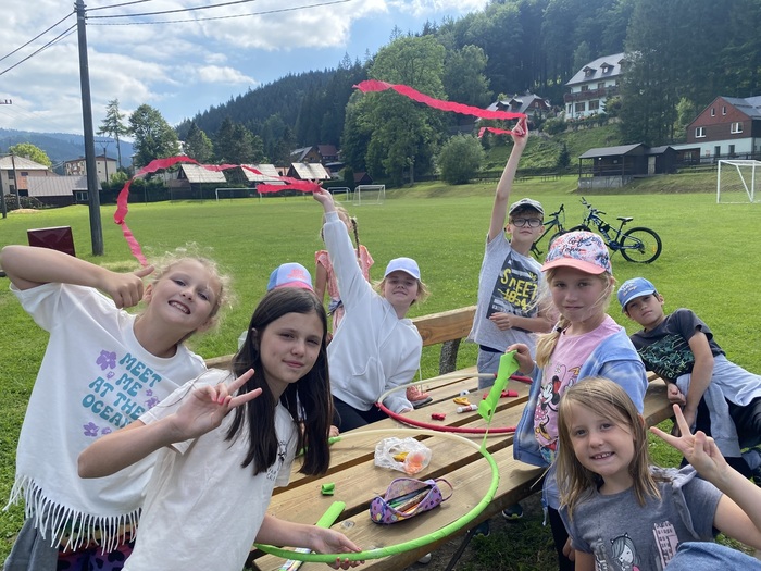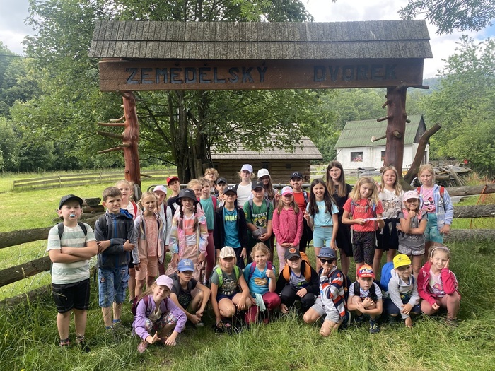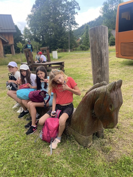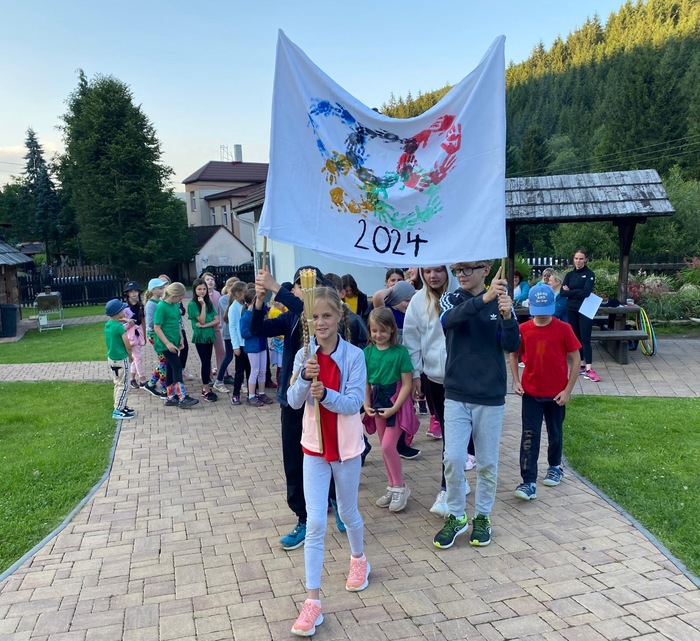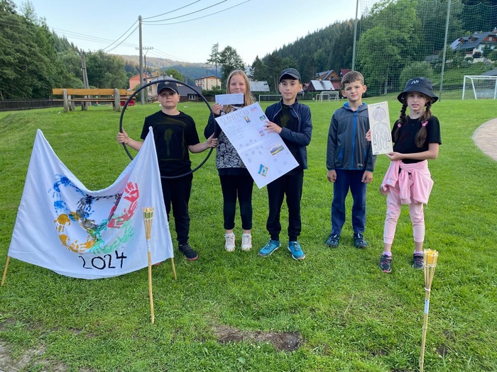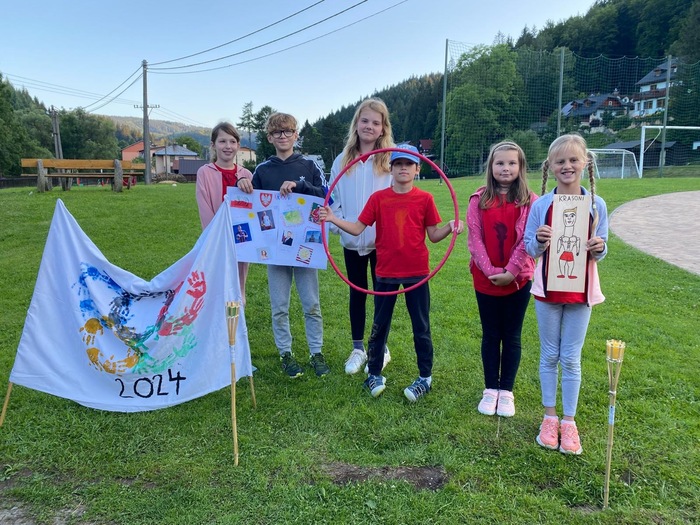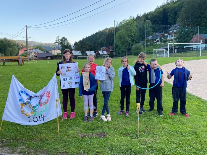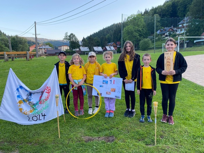 První zastávkou letošního ozdravného pobytu byla vesnice Dolní Lomná - exkurze na zemědělském dvorku. Děti tak měly možnost zhlédnout hospodářská zvířata, pohladit si kůzlátka a podívat se jak vypadá život na statku. Poté měly krátký odpočinek a svačinku a jeli jsme se ubytovat na hotel. Děti byly rozděleny do pokojů, poobědvaly vývar, smažené kuře s bramborovou kaší a během odpoledního klidu měly prostor k vybalení. Po odpolední svačince (pizza) byl zahájen program ve stylu olympijských her. Děti byly rozděleny do skupin, vylosovaly si příslušné státy, které budou reprezentovat a následovala výroba plakátů s bližší charakteristikou. Následovalo zdobení triček. Energii na večerní program doplnily večeří, kde si pochutnaly na vepřovém na šťávě s rýží a následovalo zahájení olympijských her, večerní hygiena a uložení ke spánku.