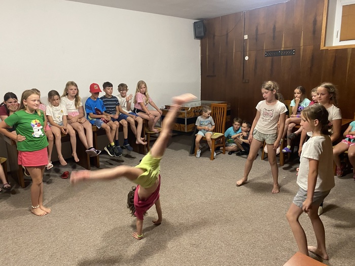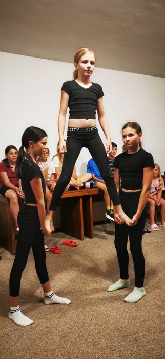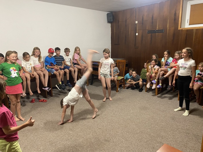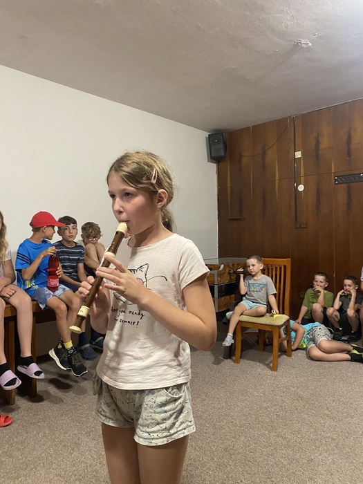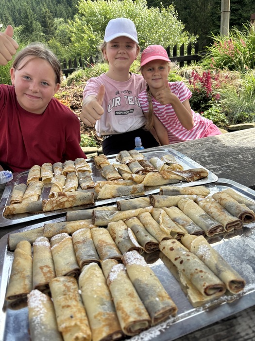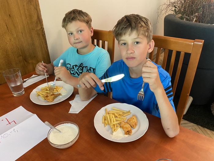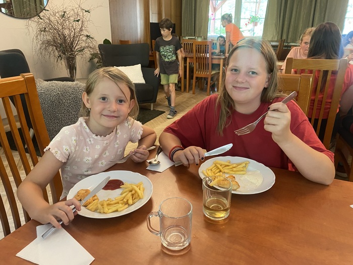 Dnešní den jsme opět odstartovali vydatnou snídani, abychom nabrali dostatek síly na nadcházející aktivitu - vědomostní kvíz ve stylu branného závodu, který se uskutečnil v lese. Poté děti potěšila sladká svačina - palačinka s nutellou. Také jsme během dne využívali rozmanité hřiště nacházející se v blízkosti hotelu. Počasí nám opět přálo, a proto jsme se po fyzicky náročných aktivitách zchladili a zrelaxovali v bazénu. Vydali jsme se také pěšky do obchodu, aby si děti mohly doplnit zásoby dobrot a nakoupit dárky na památku pro sebe či své blízké. Následovala večeře, která u dětí měla velký úspěch - sladké jahodové knedlíky. O večerní program se postaraly šikovní a odvážní účinkující v soutěži Děti z Hrabyně mají talent. A nesmíme zapomenout na dnešní dobrodružství s baterkami při výpadku elektřiny z důvodu velké bouře.