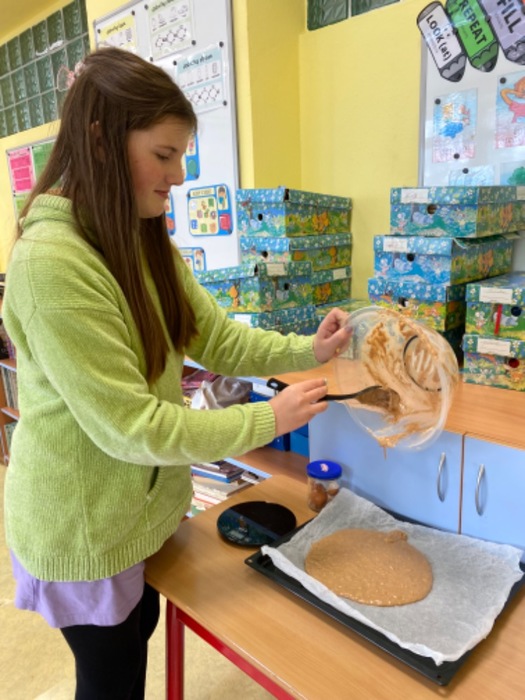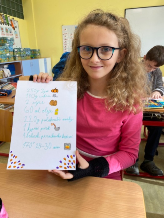 S žáky čtvrté a páté třídy jsme v rámci pracovních činností pekli voňavý dýňový perník. Děti si vyzkoušely přípravu těsta a sepsaly si recept do vlastní knihy receptů. Na perník se pak s chutí vrhli s takovou vervou, že jsme ani nestihli pořídit finální foto.