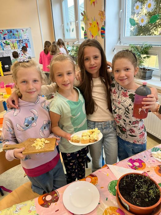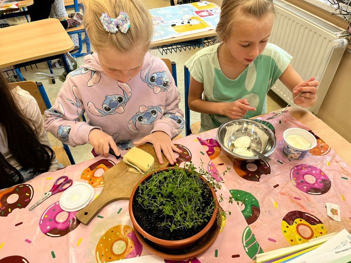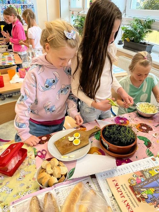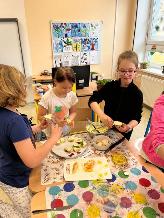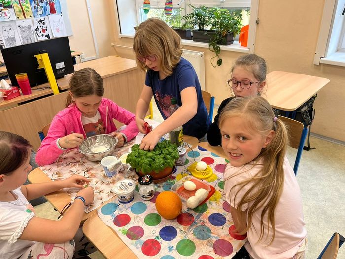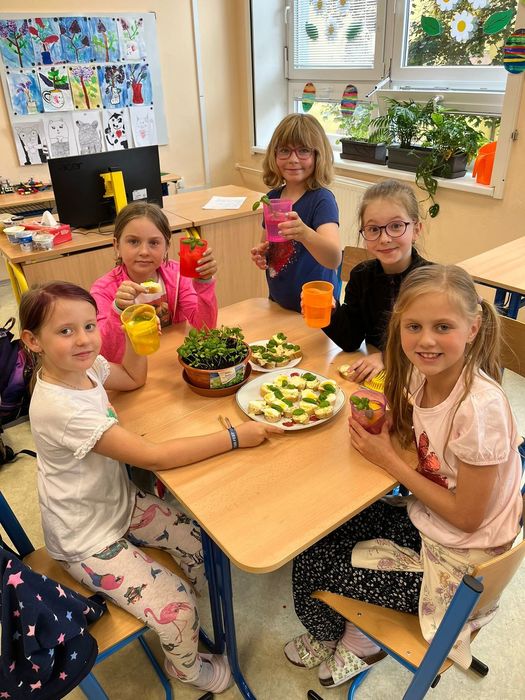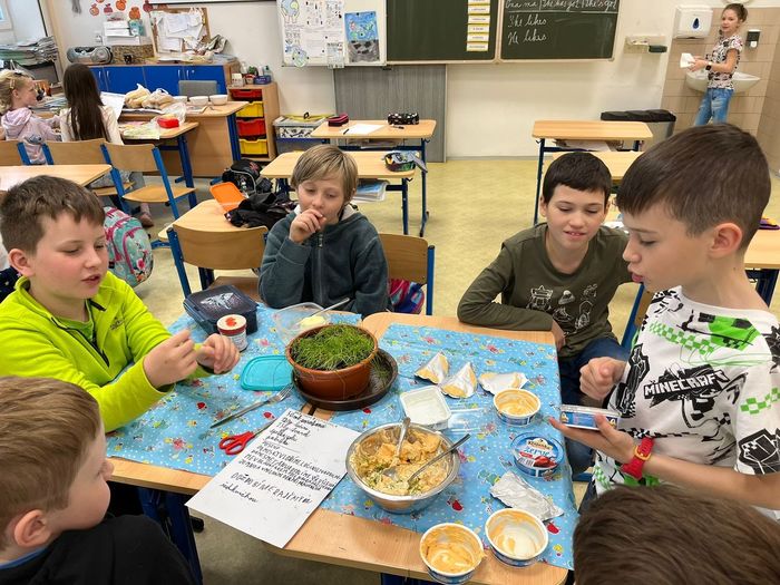 Žáci si z vypěstovaných bylin vyrobili domácí pomazánky. Ve vytvořené skupině si našli recept a popis pracovního postupu, přinesli potřebné ingredience a vrhli se na samotnou výrobu. Pomazánky se jim moc povedly.